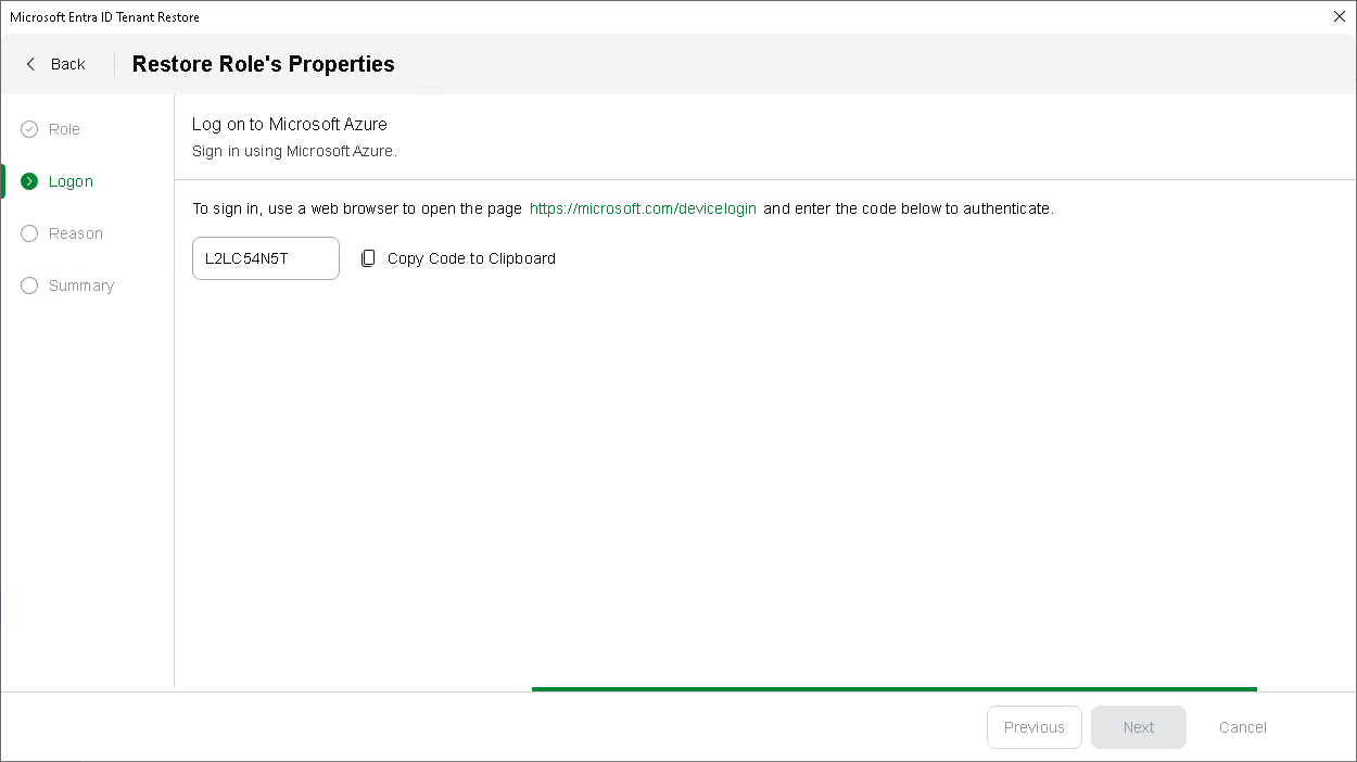 At the Logon step of the wizard, specify a Microsoft Entra ID account associated with the tenant.