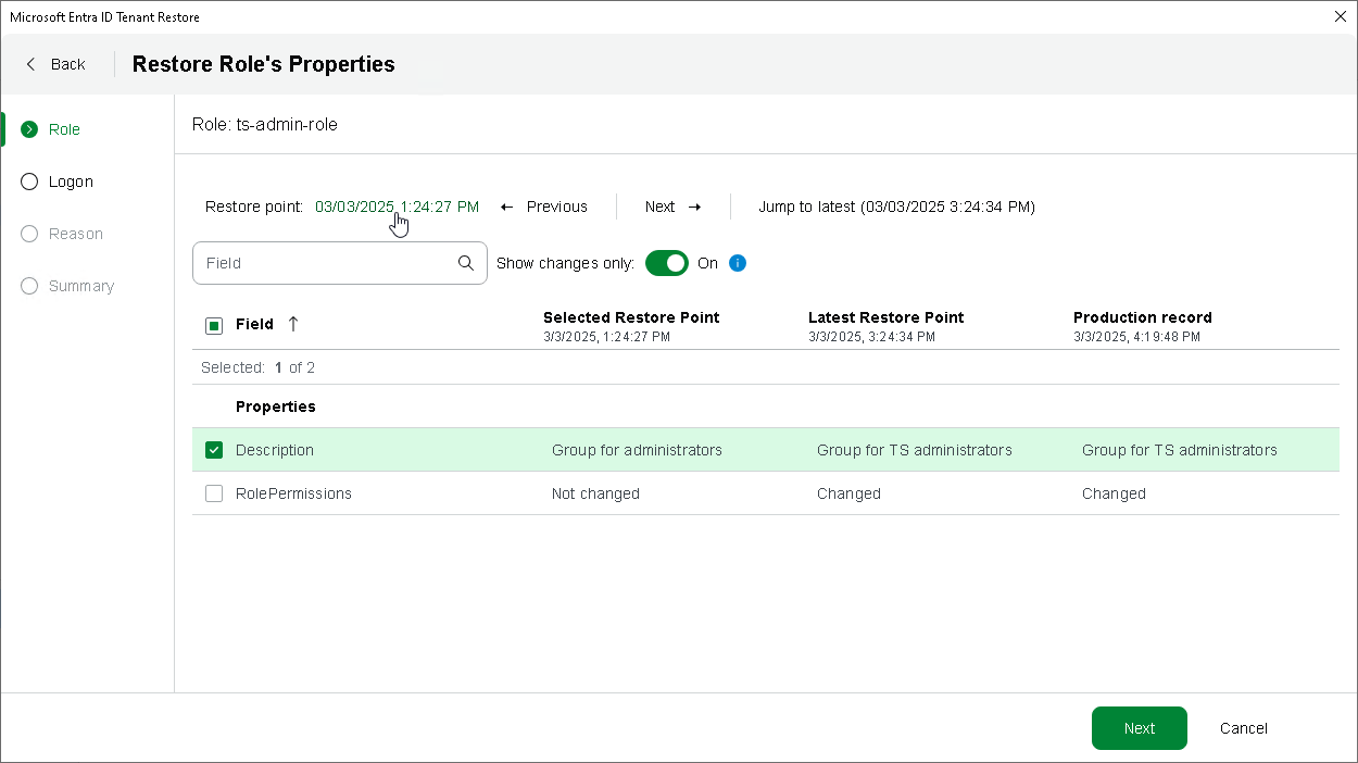 - In the list of properties, select the properties you want to restore. In the Selected Restore Point, Latest Restore Point and Production record columns, you can see values of the properties at different moments of time.