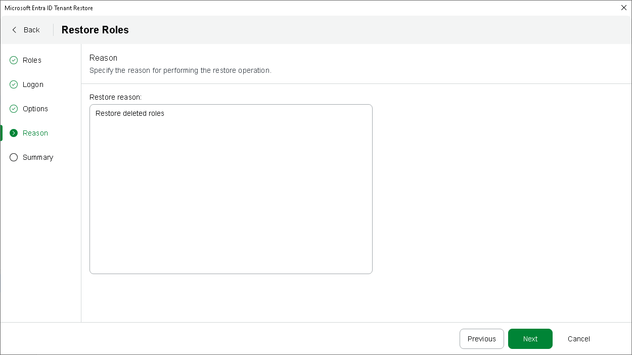 At the Reason step of the wizard, enter a reason for restoring roles. This information will be saved to the session history, and you will be able to reference it later.