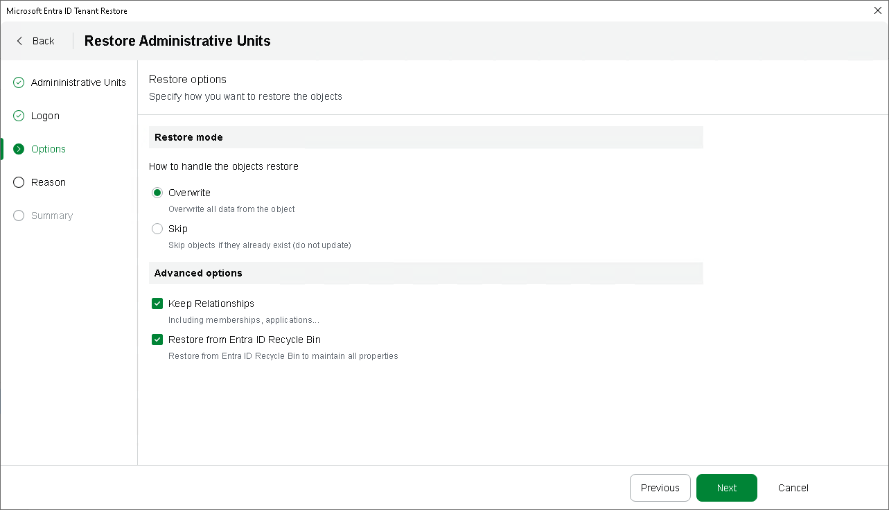 At the Options step of the wizard, configure the restore options, such as how to restore administrative units, their relationships and other:
