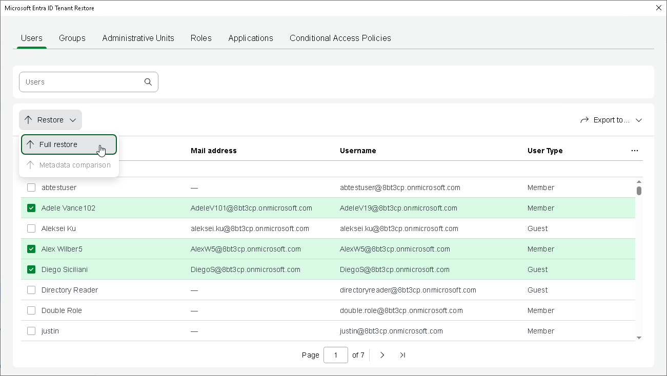 - To launch the user restore wizard, click Restore > Full Restore. Alternatively, right-click one of the selected users and select Restore > Full restore.