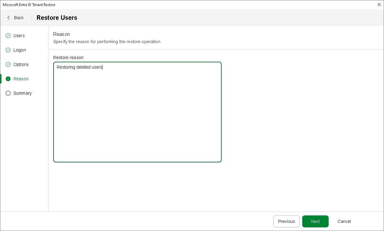 At the Reason step of the wizard, enter a reason for restoring users. This information will be saved to the session history, and you will be able to reference it later.