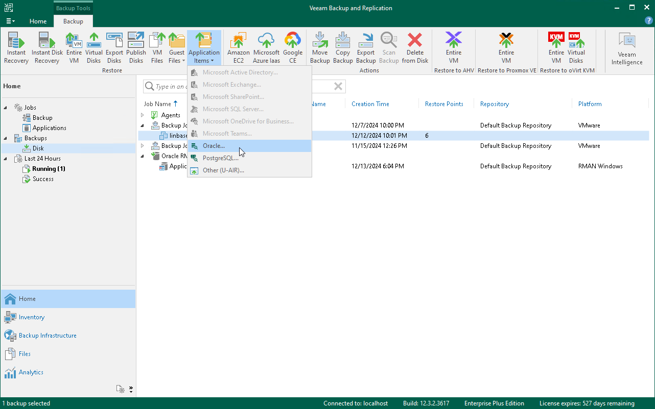- In the Veeam Backup & Replication console, select the necessary backup and click Application Items > Oracle (or Windows) on the ribbon.