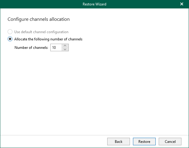 Channels are used to restore data in multiple threads per session. Using multiple threads allows Veeam Explorer for Oracle to reduce the amount of time needed to complete restore sessions. For more information about allocating channels, see the Oracle documentation.
