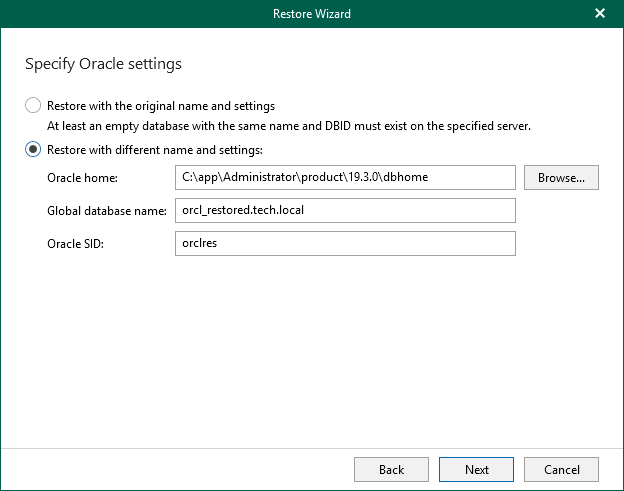 For example, if you specify the global database name as orcl_restored.tech.local, Veeam Explorer for Oracle will shorten it to orcl_res.tech.local. The database name will be orcl_res, while the unique database name will be orcl_restored.