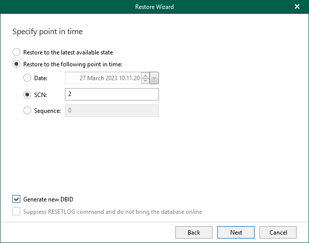 - Select the Restore to the latest available state option to restore data as of the latest available state.