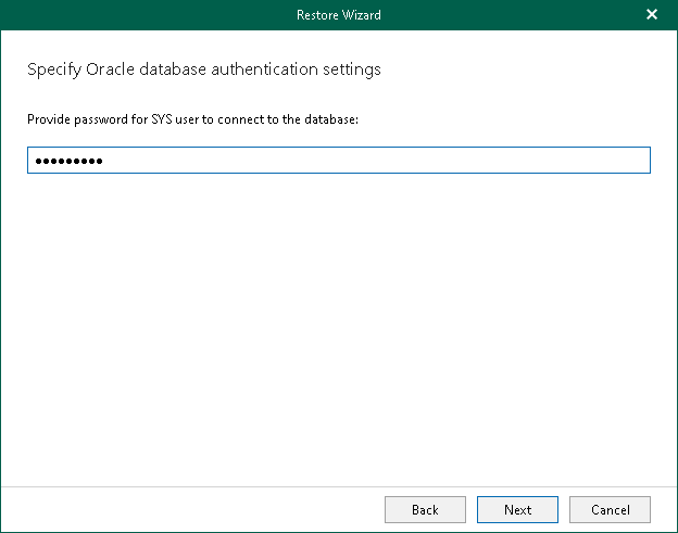 This is an archive version of the document. To get the most up-to-date information, see the current version. Step 6. Specify SYS User Password This step of the wizard is available if OS authentication to Oracle databases is disabled on the target server.At this step of the wizard, enter the password for the SYS user of the database.