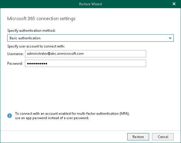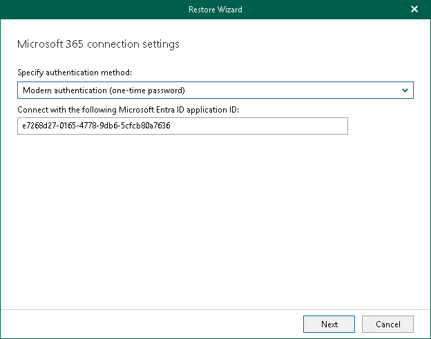 Modern authentication allows Veeam Backup for Microsoft 365 to use a Microsoft Entra application for data restore. Such an application is used to restore the specified mailbox, folder or item back to Microsoft 365 organizations with enabled multi-factor authentication (MFA). For more information, see the Adding Microsoft 365 Organizations section of the Veeam Backup for Microsoft 365 User Guide.