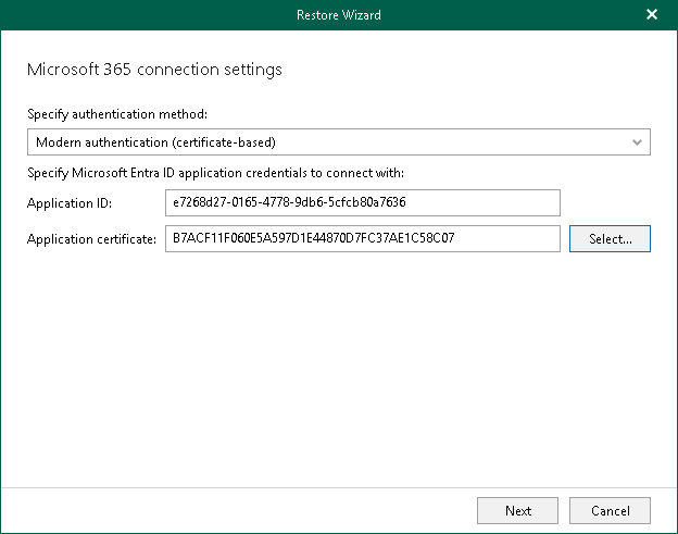 - In the Application ID field, enter an identification number of the Microsoft Entra application that you want to use for data restore.