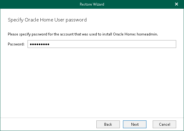 This step of the wizard is available if you restore a database to a Windows-based Oracle server and the account specified in Specify Target Server is not the Oracle home user.