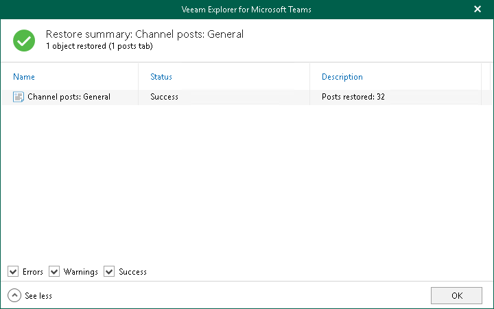 This is an archive version of the document. To get the most up-to-date information, see the current version. Step 5. Review Summary At the Restore summary step, click See more to expand the window and review details of the restore operation and click OK.You can filter notifications by their status: Error, Warning or Success.