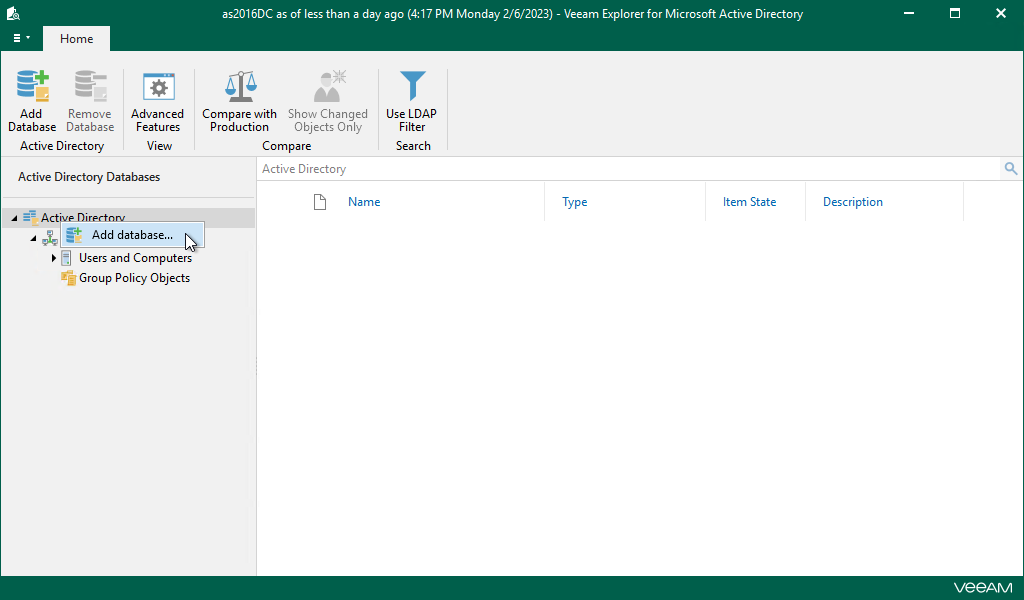 - Select the root Active Directory node in the navigation pane and click Add Database on the ribbon or right-click the Active Directory node and select Add database.