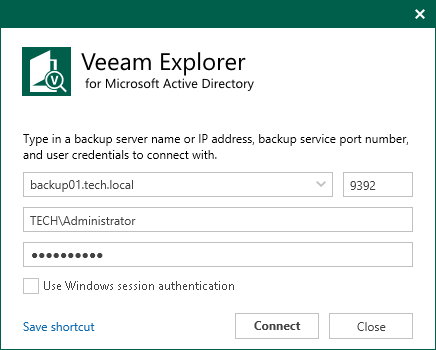 To use the account under which Veeam Explorer for Microsoft Active Directory is running, select Use Windows session authentication.