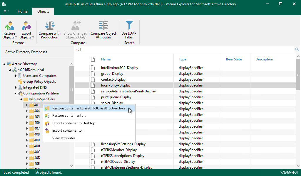 - On the Container tab, select Restore Container > Restore container to <original_location> or right-click a container and select Restore container to <original_location>.