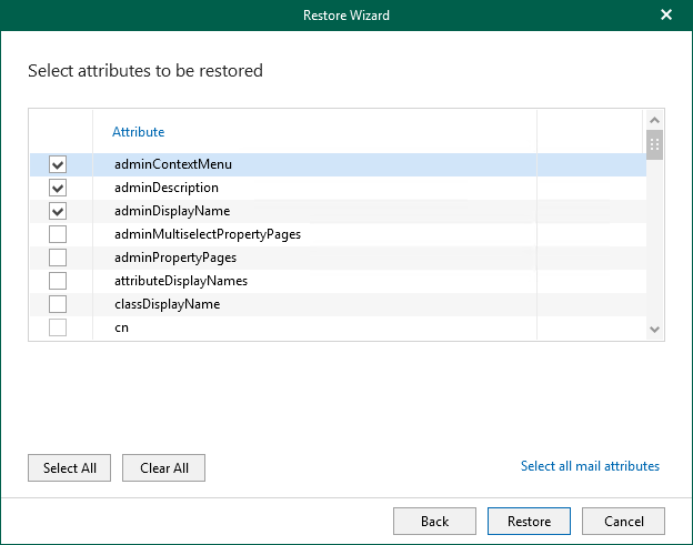 This is an archive version of the document. To get the most up-to-date information, see the current version. Step 7. Specify Attributes to Restore At this step of the wizard, select the necessary attributes and click Restore.This step is available only if you have chosen the Selected attributes only option at the previous step.