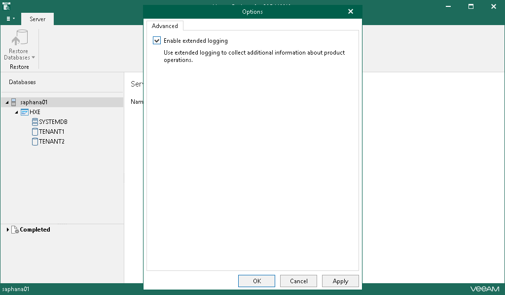 Veeam Explorer for SAP HANA allows you to enable an extended logging mode to collect more detailed logs on specific operations. After you enable extended logging, you can go back to the application and perform the actions for which you want to collect additional information. Then you can collect the logs. For more information on log collection, see Getting Support.