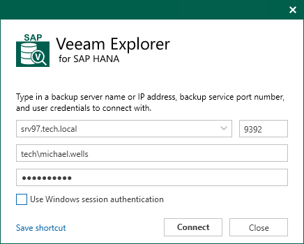 If you open Veeam Explorer for SAP HANA from the Start menu on a machine that runs the Veeam Backup & Replication console and Veeam Explorers only, specify the following: