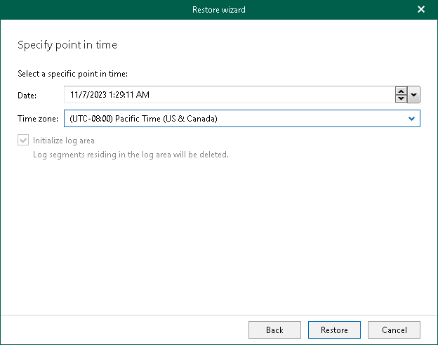 Each database will be restored to the most recent available state to the date and time selected in the Date field. Note that if any of the databases that you want to restore were first backed up after the specified point in time, their restore process will fail.