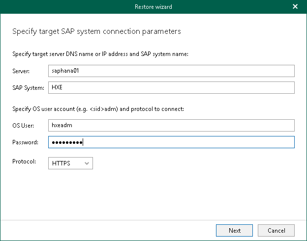 - In the Protocol drop-down list, select the protocol that Veeam Explorer for SAP HANA will use to connect to SAP Web Services, which are then used to control the target SAP HANA system.