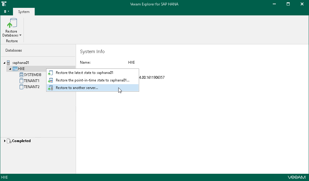 This is an archive version of the document. To get the most up-to-date information, see the current version. Step 1. Launch Restore Wizard To launch the Restore wizard, do the following:In the navigation pane, select the SAP HANA system.On the System tab, select Restore Database > Restore to another server.Alternatively, you can right-click the system and select Restore to another server.