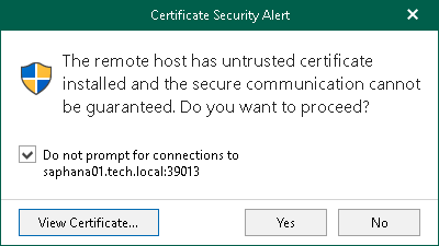 - Selecting this option will import a certificate issued by the target server to the backup server. Before proceeding with the Restore wizard, Veeam Explorer for SAP HANA will prompt you to review the certificate in the Certificate Security Alert dialog box.