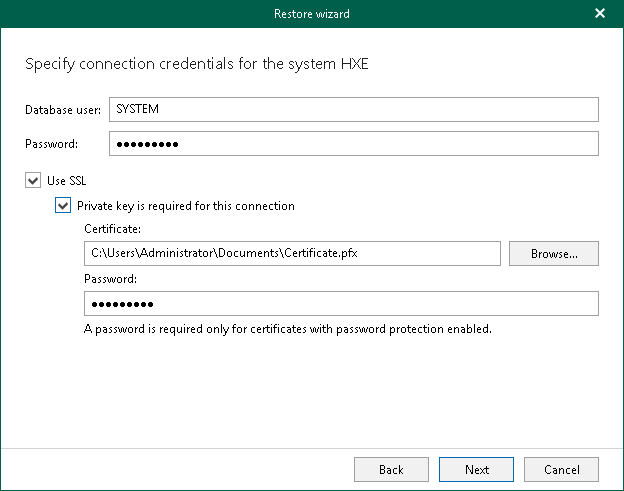 - Select the Do not prompt for connections to <host_name:port> check box if you want to use the certificate in future restore operations to the specified server. The certificate thumbprint will be saved to a configuration file on the backup server, located in %UserProfile%\AppData\Local\Veeam\Backup\SapHanaExplorer\Config.xml.