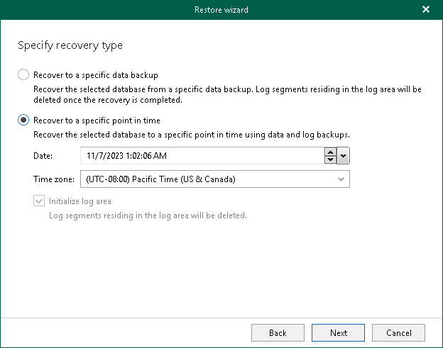 If you select the Recover to a specific data backup option, proceed to the next step of the wizard. If you select the Recover to a specific point in time option, click Restore.