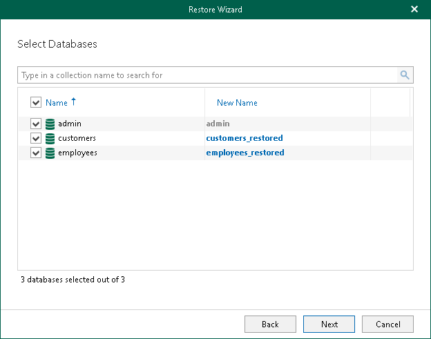 In the New Name column, you can specify a new name for the selected database on the target server. If the renamed database does not exist on the target server, it will be created.