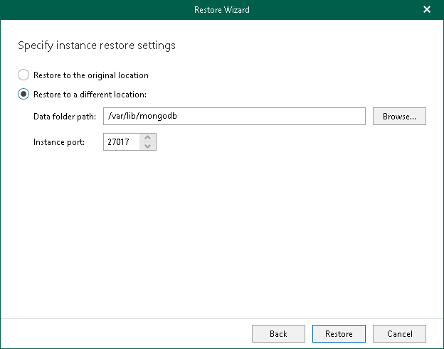 - Select Restore to a different location to restore the MongoDB instance to another data folder.