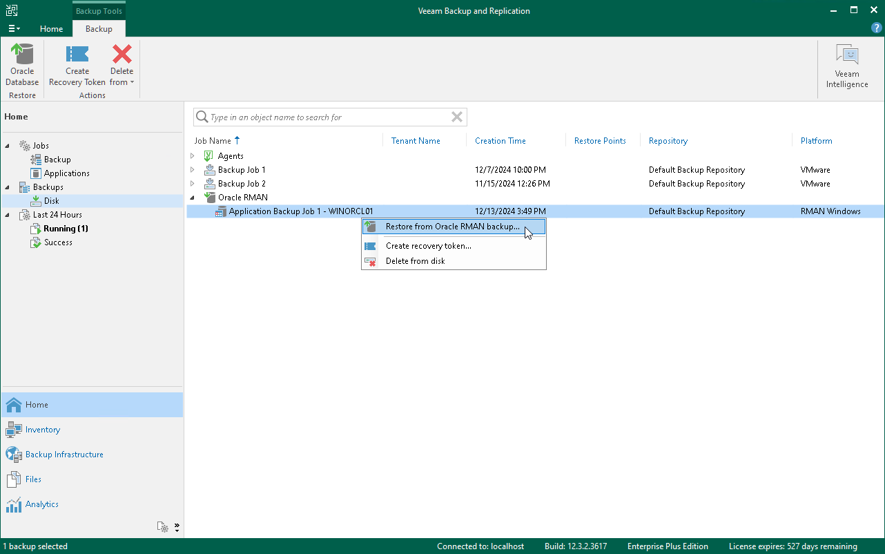 - Right-click an RMAN plug-in backup and select Restore from Oracle RMAN backup.