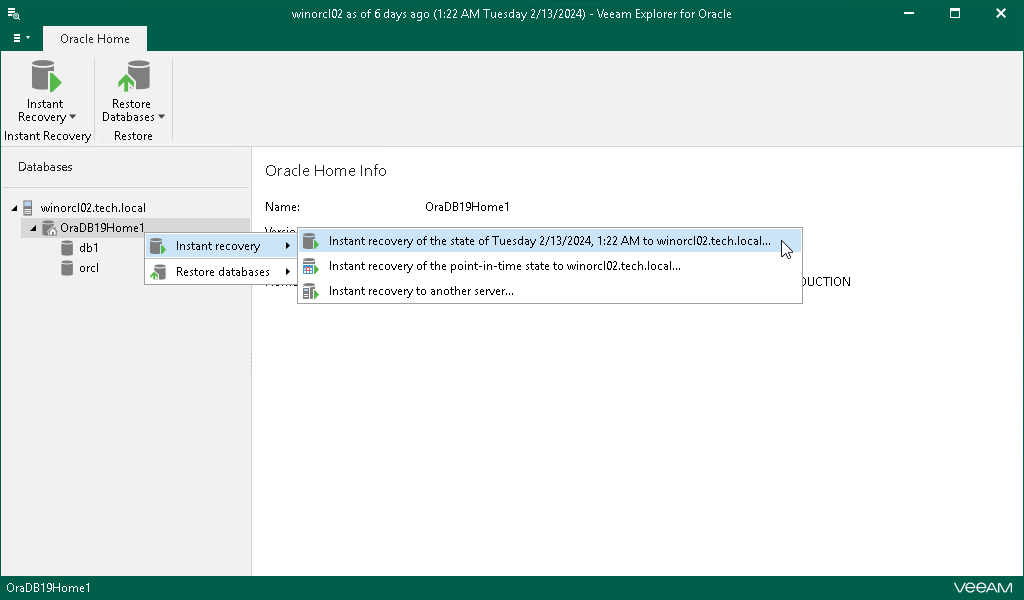Alternatively, you can right-click the Oracle server or an Oracle home and select Instant Recovery > Instant recovery of the latest state to <original_location>.