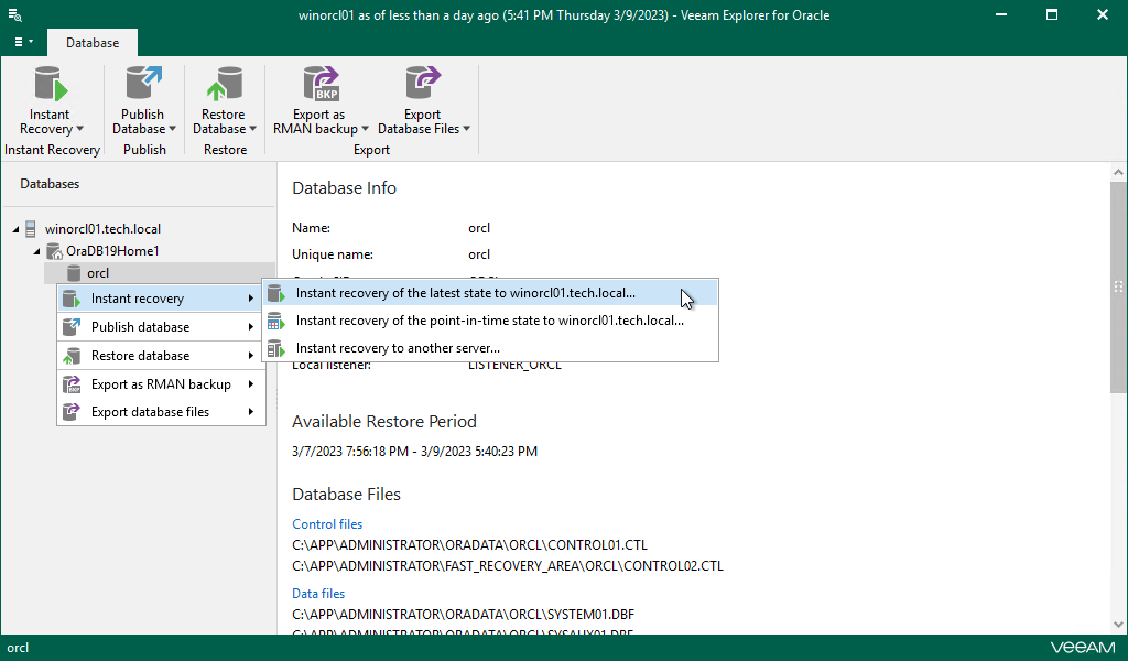 - On the Database tab, select Instant Recovery > Instant Recovery of the latest state to <original_location>.
