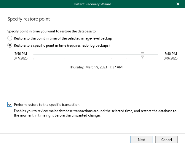 - Select the Restore to the point in time of the selected image-level backup option to load database files as of the moment when the current restore point was created.