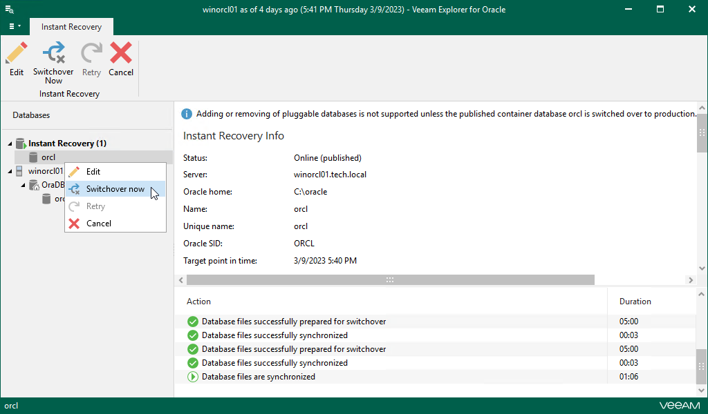 If you have selected the Manual switchover option in the Instant Recovery wizard, you can start the switchover process at any time if the database is in the Ready to switchover state.