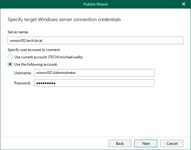 - Use the following account. Select this option to connect to the specified server using a custom user account. Then provide a user name and password for the account.