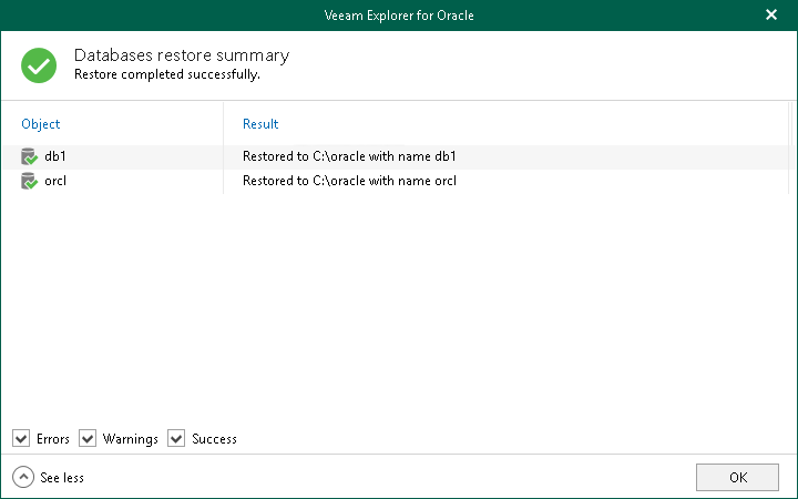 This is an archive version of the document. To get the most up-to-date information, see the current version. Step 5. Review Restore Summary At the Databases restore summary step, click See more to expand the window and review details of the restore operation.You can filter notifications by their status: Error, Warning or Success.