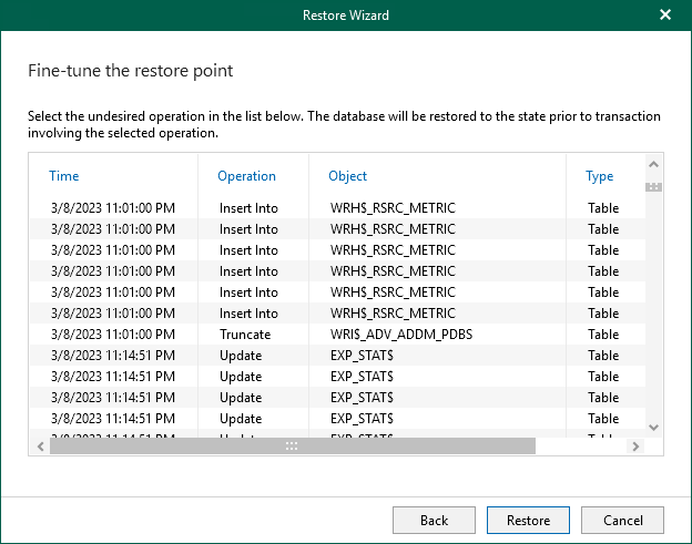 At this step of the wizard, select an operation prior to which you want to restore your database and click Restore.
