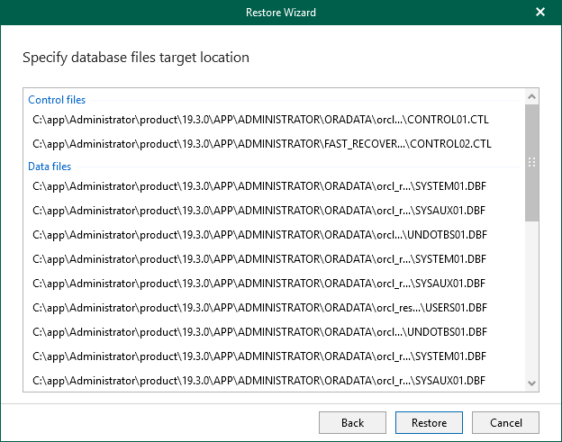 This is an archive version of the document. To get the most up-to-date information, see the current version. Step 6. Specify Database Files Location At this step of the wizard, specify the location for database files and click Restore.To edit the path, click the path row and provide the location you want to use.