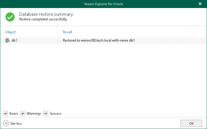 This is an archive version of the document. To get the most up-to-date information, see the current version. Step 7. Review Restore Summary At the Database restore summary step, click See more to expand the window and review details of the restore operation.You can filter notifications by their status: Error, Warning or Success.