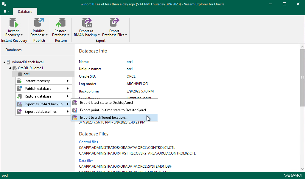 - On the Database tab, select Export as RMAN backup > Export to a different location.