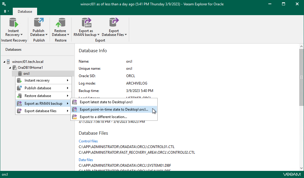 Alternatively, you can right-click a database and select Export as RMAN backup > Export point-in-time state to Desktop\<db_name>.