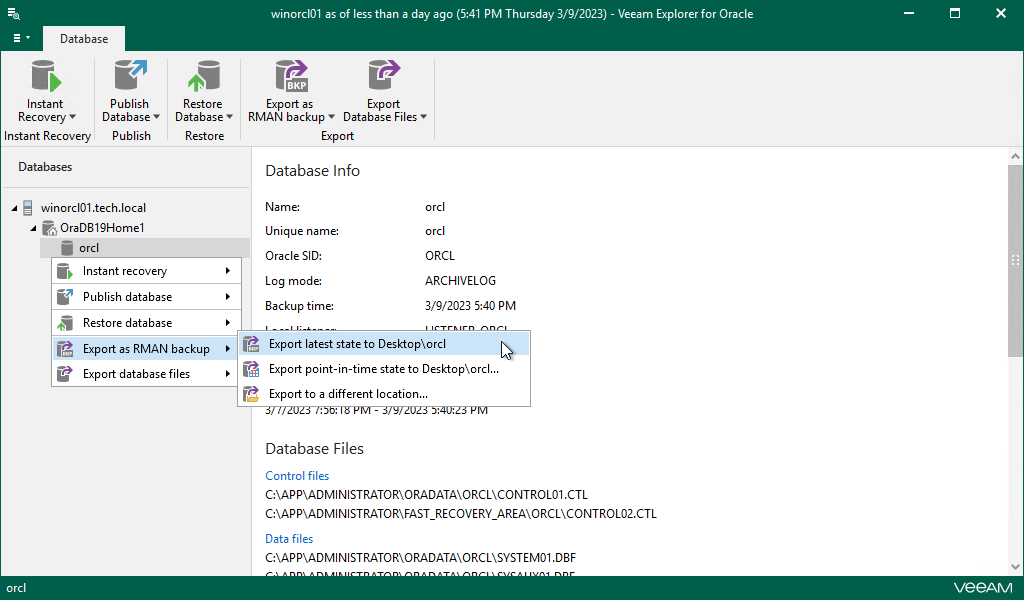 Alternatively, you can right-click a database and select Export as RMAN backup > Export latest state to Desktop\<db_name>.