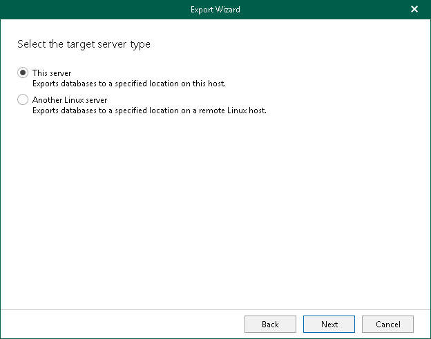 This is an archive version of the document. To get the most up-to-date information, see the current version. Step 4. Specify Target Host At this step of the wizard, specify the server to which you want to export your PostgreSQL databases.Select This server to export your databases to the local host where Veeam Explorer for PostgreSQL is running.Select Another Linux server to export your databases to any Linux server.