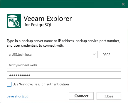 To use the account under which Veeam Explorer for PostgreSQL is running, select Use Windows session authentication.