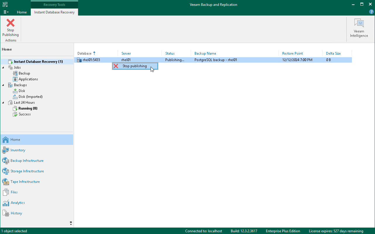 - In the preview pane, select the session and in the Instant Database Recovery tab click Stop Publishing.