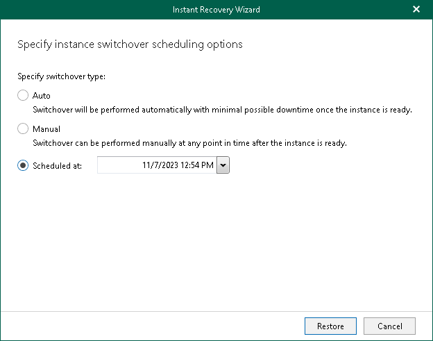 - Scheduled: switchover is performed at a specified date and time. Use the drop-down calendar to specify the date and time.