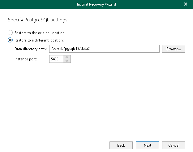 - Specify a location to which you want to restore the PostgreSQL instance: