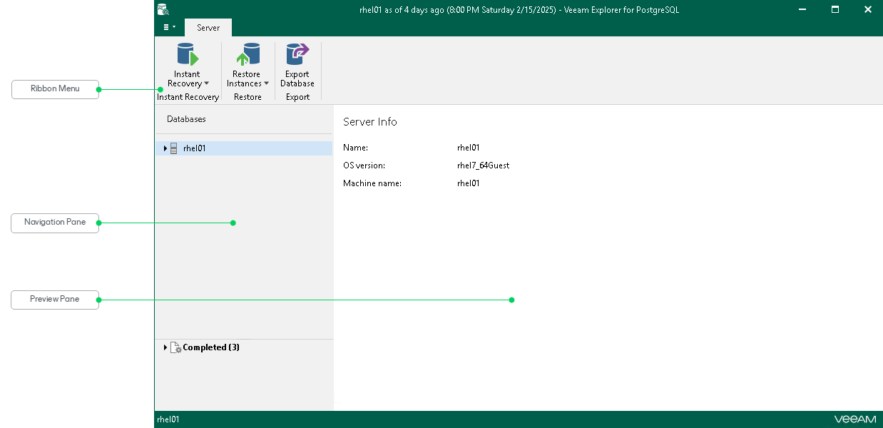 The user interface of Veeam Explorer for PostgreSQL is designed to let you quickly find commands that you need to restore PostgreSQL instances from backups.