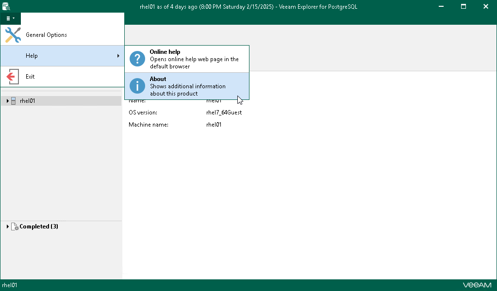 - Exit. Closes the Veeam Explorer for PostgreSQL window.