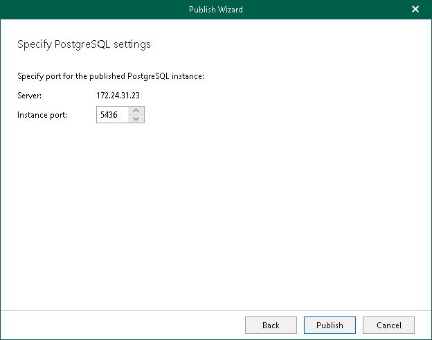 At this step of the wizard, specify a free PostgreSQL instance port in the Instance port field and click Publish.